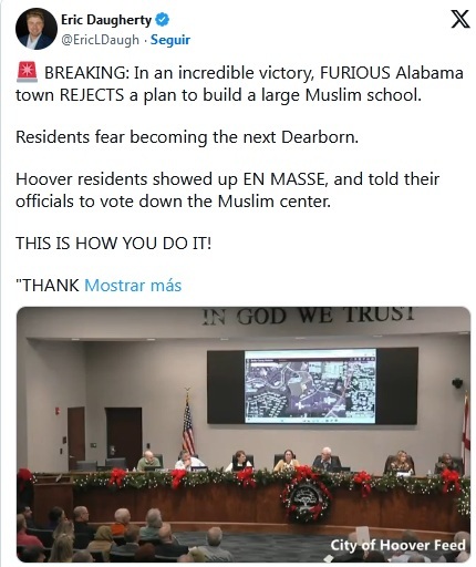 This tweet (screenshot here) came from The Gateway Pundit, but I am LOATH to link to its Gateway Hispanic posts*. You can watch or read here about the plans to move Moslem school and community center from nearby Homewood to Hoover.