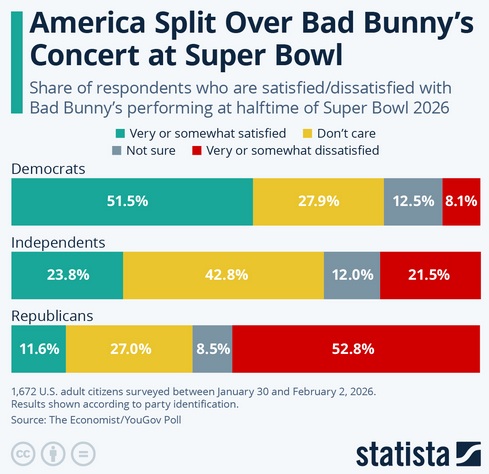 I did hear that the Seattle Seahawks won the game yesterday, but, rather than rant about Sportsball, let me show this graph of the culture war divide. It appeared in a Zerohedge article - Bad Bunny Halftime Show Versus Turning Point USA Alternative Highlights A Divided Nation . First of all, I know about the assassinated Charlie Kirk and his still-extant Turing Point - USA, but Bad Bunny? WTH??