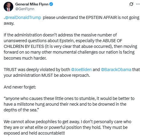 I don't know about this, the more I think about it. The problem is not just that Trump has been embarrassed into blatantly lying to us. He was supposed to go after the Deep State, but he backed right off due to, we can only surmise, his being on the list. He's gone through so much that I didn't think he was blackmailable anymore. Is what one of his biggest supporters, General Mike Flynn says here, the problem?