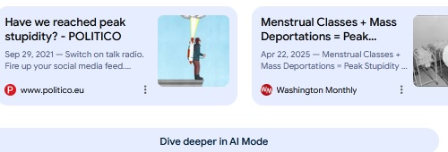 That's what I saw near the top of the screen after a google search on "Peak Stupidity" just now. I get to my site this way, via a handful of search sites and from different places or devices, purposely to bring us to the TOP. We are above the image shown, thankfully, but google users might mistakenly think that its AI is somehow helpful.