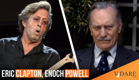 Listen to me, man! I think we should vote for Enoch Powell. Enoch’s our man. I think Enoch’s right, I think we should send them all back. Stop Britain from becoming a black colony. Get the foreigners out. Get the wogs out. Get the coons out. Keep Britain white. I used to be into dope, now I’m into racism. It’s much heavier, man. F*cking wogs, man. F*cking Saudis taking over London. Bastard wogs. Britain is becoming overcrowded and Enoch will stop it and send them all back.Firstly, now I can guess more accurately what a "wog" is. Secondly, Enoch Powell was a scholarly, true-Conservative British Minister of Parliament for 37 years (1950 - 1987), famous at VDare and elsewhere for his "Rivers of Blood" speech in April of 1968. He was the British version of, well, maybe NOBODY America had, warning of this existential threat to his country.