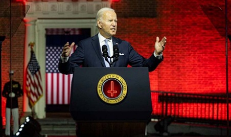 "We are determined to stamp out violent white extremism to preserve Our Democracy™!" Biden shouted from a podium, clenching his fist, flanked by two Special Soldiers as he stood in front of an imposing blood red color scheme. "Donald Trump and the MAGA Republicans have been identified as threats to Our Democracy™, and we are treating them as such. We must preserve the fabric of our nation from these vermin. We must re-educate these MAGA extremists!"