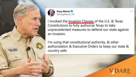 The prolific* new writer A.W. Morgan at VDare.com has a quick post up with some good news from the Republic of Texas. He reports Abbott Goes There: Declares Invasion At Border Under U.S., Texas Constitution. They've had the TX Constitution since, what, the Alamo? OK, the last un-amended one was ratified in 1876. The United States was formed for a common defense in 1789. The border invasion has been going on for arguably 40 years - I'm going by just before the time of the Reagan-signed amnesty bill of 1986.