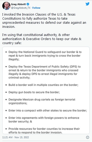 GOVERNOR AS COMMANDER-IN-CHIEF OF MILITARY FORCES. He shall be Commander-in-Chief of the military forces of the State, except when they are called into actual service of the United States. He shall have power to call forth the militia to execute the laws of the State, to suppress insurrections, and to repel invasions.There you go. It all looks completely on the up-and-up. Go Governor Abbott!! I'll leave you all with a screenshot of a tweet with more details: