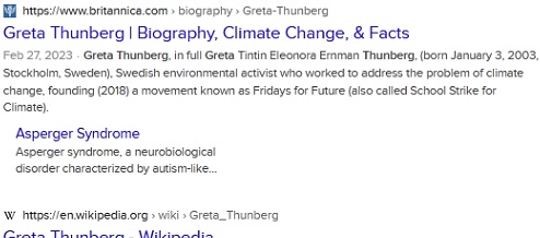 For a humorous ending here, this was the beginning of the search results for "Greta Thunberg middle name" on duckduckgo:
