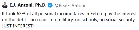 Personal income tax is half of what the government takes in. That isn’t good.Well, it's more simple, and it gives more understanding of the situation, to just say that last month the US Gov't had to spend just under 1/3 of all money taken in on interest payments on that $34,000,000,000,000 "note".