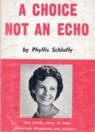 Mrs. Schlafly didn't make it far in her attempts at a political office. In 1952 she won the GOP primary but lost in the election for US Congressman (I think it would have still been called?) from Illinois. She tried again in '60 but she was soundly defeated then too. It was 4 years later, when Barry Goldwater was running in the GOP primaries, that she did what COULD have been her most important accomplishment. That was her writing of the short book A Choice, not an Echo to support Mr. Goldwater against the east coast squish** establishment. It would have been had the Libertarian/Conservative Goldwater won that election. (As it was, the book was said to have helped AuH2O win the California primary.)