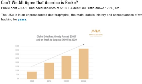 DOGE may make bigger inroads than I have ever imagined, or CAN, imagine, but, no. We're between a rock and a hard place. If you can't get what Peak Stupidity has been preaching here, that great ZeroHedge article explains it pretty simply and concisely . And, of course, Gold, Bitchez!