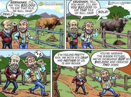 ... with the help of Economists Extraordinaire Ben Bernanke and Paul Krugman, ... and a couple of bulls. I refer not to the famous Scottish Economist Adam Smith, who would have enjoyed, or perhaps did enjoy, a simliar cartoon, but to our illustrious commenter Adam Smith who gets Economics. Thanks for this one, Adam!