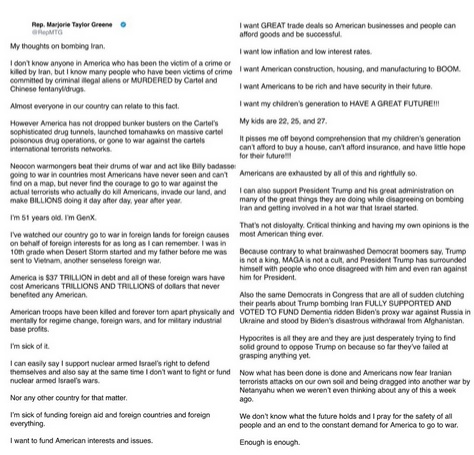 "Enough is Enough" - yes, I hope. MTG's bit about bombing drug cartels is ... a real stretch... but I agree with the gist of her statement. Note that she's not abandoning MAGA or Trump, or going out to vote for A.O.C. in 3 years.