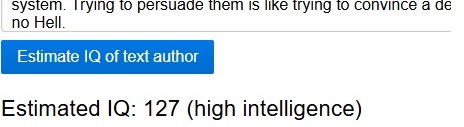 PS: Adam, I pasted the very same in, but WritingToIQ said it was too short. I pasted it in again, and it gave me a 185. Does it not see exact duplication of writing as a sign of stupidity? This may be some sort of Biden waiver. Anyway, then I put "nigger" at the end of each of the blurbs, and it brought me down 3 IQ points.