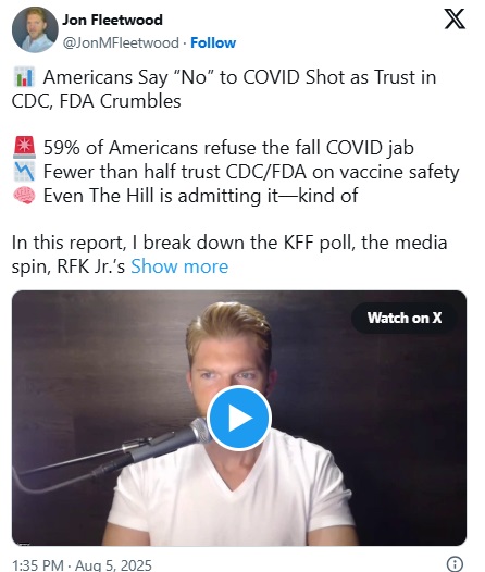 What it comes down to now is a lack of trust. We've seen the headlines about this. It's no longer just about the lying out of Fauci, Birx, and that gang. Like him or not, believe he knows a lick about science or not, we've got this RFK, Jr. as health secretary**, and he's not down with the standard narrative. The healthcare establishment does not like anyone rocking their boat.