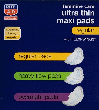 "Do we have any of the green ones? It says 'heavy flow pads'. We should get some of those.