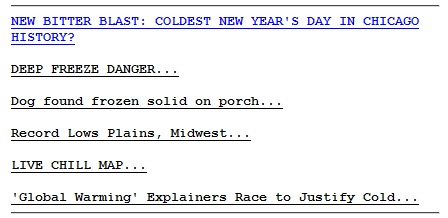 It's that last one down, ""Global Warming" [sick] Explainers Race to Justify Cold" that really displays the stupidity of this whole climaphobia (not a sexually-transmitted disease, but possibly worse; you're thinking chlamydia, hell, I have no idea what you're thinking) episode that's been festering for well nigh a couple of decades with no